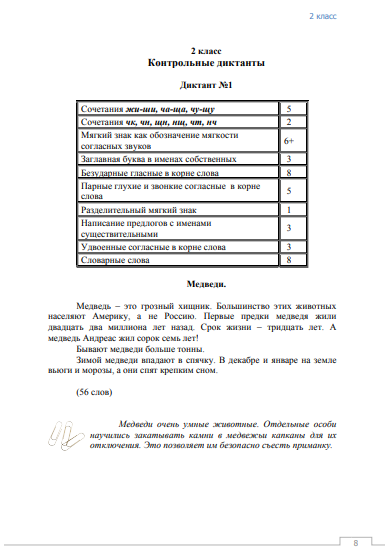 перед каждым диктантом есть таблица с орфограммами с указанием их количества, чтобы учителю или методисту было легче выбрать необходимый материал,
