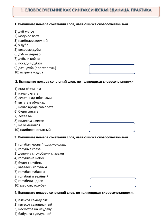 - отработку всех типов и видов словосочетаний на уникальных примерах;