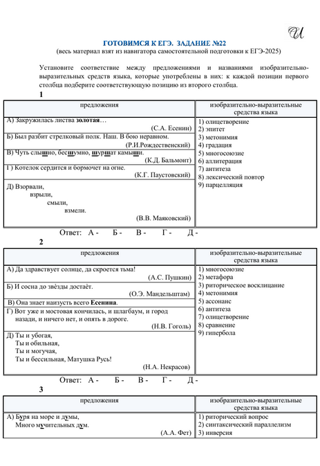 2 ступень – это знакомство учащихся с примерами художественно-выразительных средств языка, взятых из «Методических рекомендаций обучающимся по организации самостоятельной подготовки к ЕГЭ 2026 года» (навигатора подготовки). Этот блок заданий составлен в облегченной форме, в формате 5 на 5 и предназначен для тех учащихся, которые чувствуют себя неуверенно, решая №22. Блок включает в себя 2 варианта по 10 заданий.