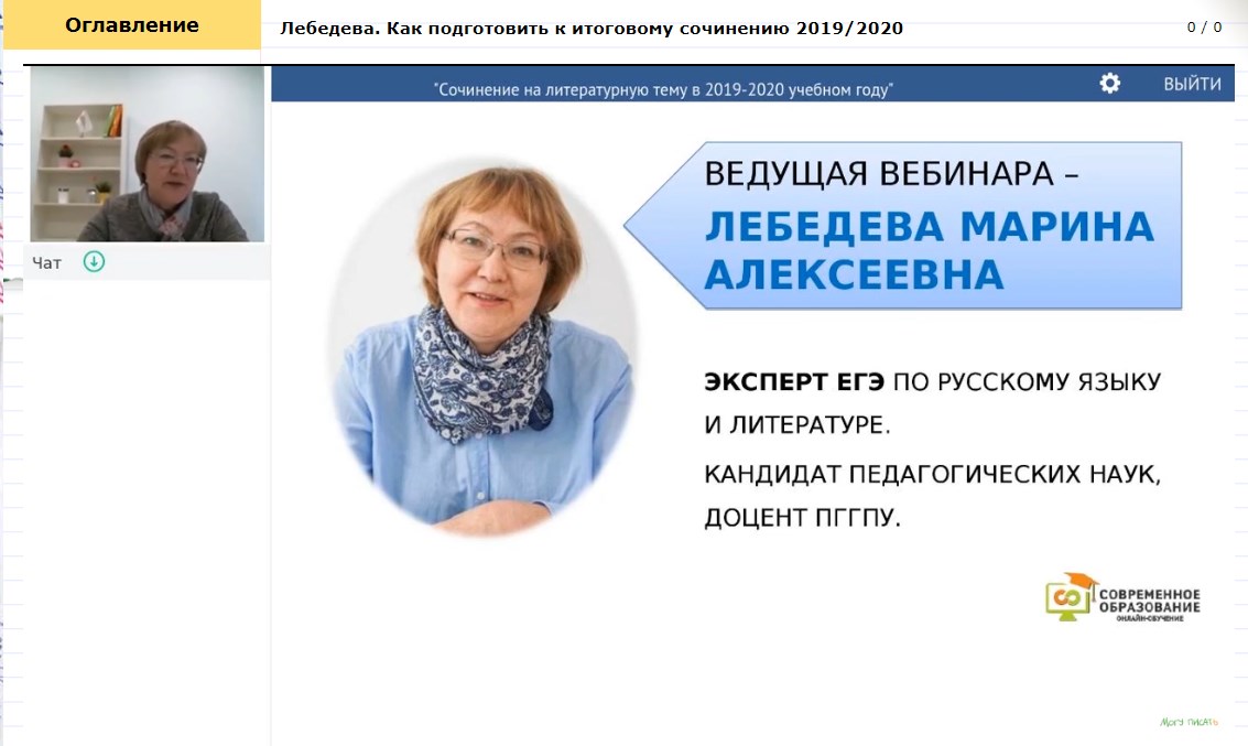 1 октября в учебном центре "Современное образование" состоялся вебинар «Сочинение на литературную тему в 2019-2020 учебном году», который проводила Марина Алексеевна Лебедева, эксперт ЕГЭ по русскому языку и литературе, кандидат педагогических наук, доцент ПГГПУ.